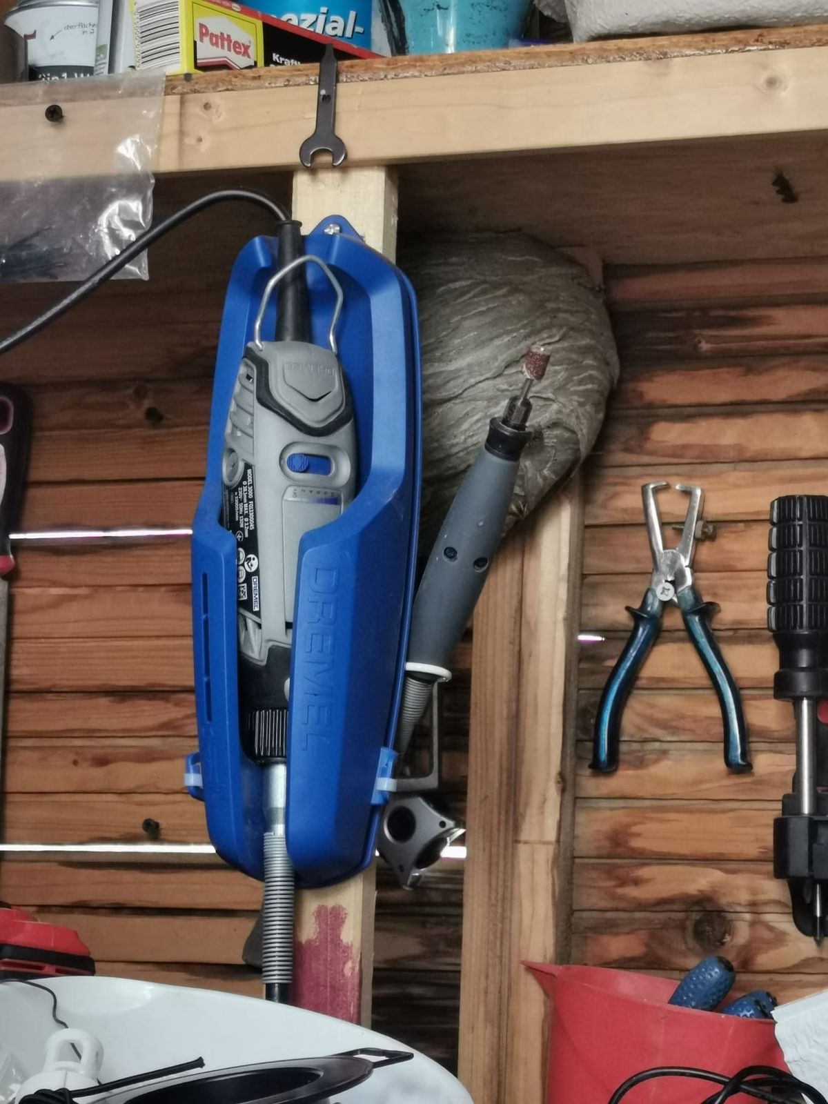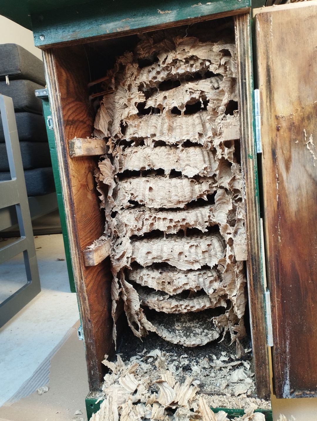 Im Jahre 2022 hatte die "Gemeine Wespe" dieses Nest in einem Rolladenkasten gebaut.Da sie aber nicht ins Zimmer gelangten und auch sonst niemanden belästigt haben wurde das Nest belassen und im Feb. 2023 entfernt. Dabei entstand dieses Bild.
