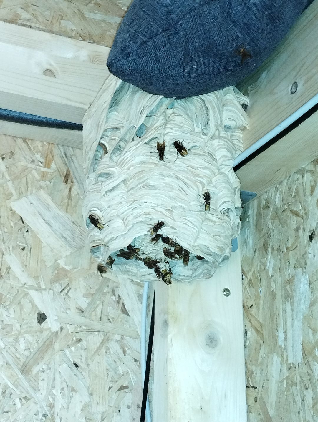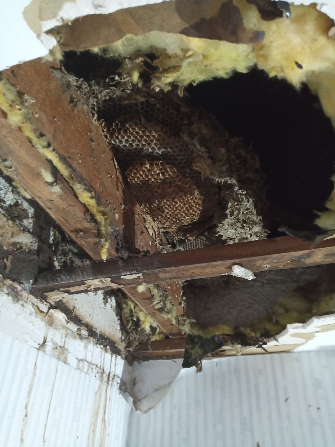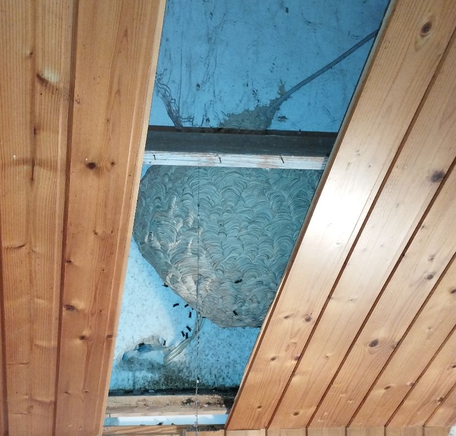 Im Jahre 2023 hatten Hornissen dieses Nest unter einem Dach über der obersten Geschossdecke gebaut. Hier bestend die Gefahr, dass die Hinterlassenschaften der Tiere die Deckenplatten aufweichen und dann in den Innenraum durchbrechen.