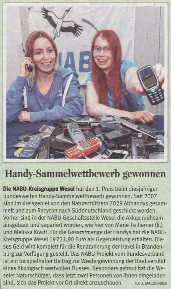 | Handy-Sammlung beim NABU wird fortgesetzt - wir sammeln weiterhin alte / defekte Handys! Wenn Sie noch ein altes Handy zu Hause haben - egal ob und wie defekt - wäre es nett, wenn Sie es uns überlassen würden, denn wir machen gemeinsam mit einem Mobilfunk-Anbieter eine Sammelaktion! Für jedes beim NABU abgegebene Althandy erhält der "Naturschutzbund Deutschland" von einem Recycler eine Spende in Höhe von etwa zwei EURO für das aufwändige und anspruchsvolle NABU-Renaturierungsprojekt "Untere Havel". Als positiven Nebeneffekt der Spende für einen guten Zweck haben Sie damit auch die Sicherheit, dass die Wertstoffe Ihres alten Handys wiederverwendet und sinnvoll genutzt werden und nicht irgendwo SEHR umweltschädlich im Müll landen. (Bisher wurden in der NABU-Kreisgruppe schon weit über 7.000 Althandys gesammelt - wodurch das Naturschutzprojekt "Untere Havel" mit etwa 20.000 EURO unterstützt werden konnte.) Lesen Sie dazu diesen Zeitungsartikel: ![]() Wenn Sie unsere verschiedenen Sammlungen bei den Info-Veranstaltungen nicht wahrnehmen können - es gibt ständige Sammelstellen für die Althandys: