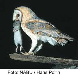 Die Schleiereule ernährt sich fast ausschließlich von Kleinnagern, vor allem von Feldmäusen, aber auch von Ratten, Fröschen und Insekten. Die getötete Beute wird in einem Stück verschlungen wenn sie nicht zu groß ist - sonst wird sie mit dem Schnabel zerteilt. Zur Fütterung der Jungen wird sie in kleine Stücke zerrissen. Die unverdaulichen Reste, Knochen, Chitin, Fell und Haare werden später als "Gewölle" ausgespien. StimmeDas Weibchen ruft wiederholt einen schnurrenden Schrei, das Männchen ruft seltener. Der Gesang ist ein langgezogenes, ratternd oder gurgelndes schrilles, heiseres Quietschen und heiseres gedehntes Kreischen. Die Bettelrufe der Jungvögel bestehen aus einem langen, keuchenden Schnarren. Verhalten / JagdIhr Flug ist dank der weichen, gezähnten "Eulenfedern" am Flügelbug nahezu geräuschlos. Sie verfügt über ein hochpräzises optisches und akustisches Ortungssystem. Der Gesichtsschleier dient dem Gehör dabei praktisch als "Schallverstärker", mit dem sie auch in totaler Dunkelheit präzise und lautlos ihre Beute orten und greifen kann, die dann mit Genickbiss getötet wird. Bei der Flugjagd folgt sie relativ starr ihren festgelegten Jagdrouten. Fortpflanzung / BrutSchleiereulen leben meist in Dauerehe und sind recht standorttreu. Als Brutplätze werden meist ruhige, dunkle Ecken und Nischen in Dachböden, Scheunen und Kirchtürmen genutzt. Es wird kein Nistmaterial eingetragen. Die Balzzeit beginnt etwa im März. Im April / Mai werden 3-12 länglich-ovale, weiße Eier gelegt und für ca. 4 Wochen vom Weibchen bebrütet. Es wird während dieser Zeit, und danach noch bis die Jüngsten 3 Wochen alt sind, vom Männchen mit Nahrung versorgt. Die Nestlingszeit beträgt ca. 10 Wochen. Im Alter von 3 Monaten wandern die Jungen aus dem elterliche Revier aus, meist nicht mehr als 50 km. Die Wanderbewegungen sind dabei in der Regel abhängig von dem aktuellen Nahrungsangebot. In guten Mäusejahren können die Eulen auch zwei mal brüten. Sterblichkeit / AlterDie Sterblichkeit bei der Schleiereule ist sehr hoch. Über 70% sterben bereits im 1. Lebensjahr, in den Folgejahren sind es rund 60%. Das Höchstalter in freier Natur beträgt etwa 12 - 17 Jahre. Bestand und GefährdungObwohl die Art als "nicht gefährdet" gilt, weil der weltweite Bestand auf etwa 5 Mio. Tiere geschätzt wird, muss man registrieren, dass in Europa die Art in den letzten Jahrzehnten stets deutlich seltener geworden ist. Und das, obwohl die Kulturlandschaft Europas früher eigentlich besonders günstige Bedingungen geboten hat. Die Ursache liegt zum größten Teil in der Intensivierung der Landwirtschaft, die durch moderne Bewirtschaftung den Nahrungslebensraum negativ beeinflusst und daraus folgend dem verringerten Nahrungsangebot für die Schleiereule. Ortsnahe Lebensräume mit Streuobstwiesen, Hecken und Feldrandstreifen gibt es immer weniger, und Scheunen und Schuppen werden ganz modern immer mehr versiegelt. Auch durch strenge Winter werden die Bestände teils erheblich reduziert. SchutzmaßnahmenWenn geeignete Lebensräume vorhanden sind, kann man der Schleiereule durch Anbringung von Bruthilfen oft helfen. Dabei ist darauf zu achten, dass die Nistkästen ausreichend groß sind und einen Dunkelbereich besitzen. Die Kästen werden am günstigsten im Innern von Scheunen an der Wand mit der Flugöffnung nach außen angebracht, oder im Innern einer offenen Scheune mardersicher aufgehängt. |